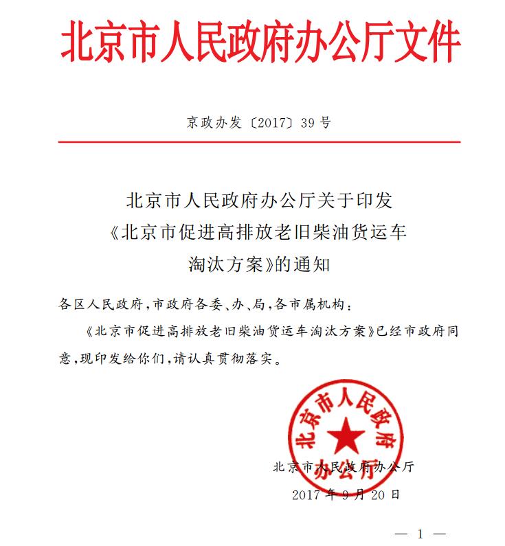 北京市人民政府辦公廳關(guān)于印發(fā)《北京市促進高排放老舊柴油貨運車淘汰方案》的通知